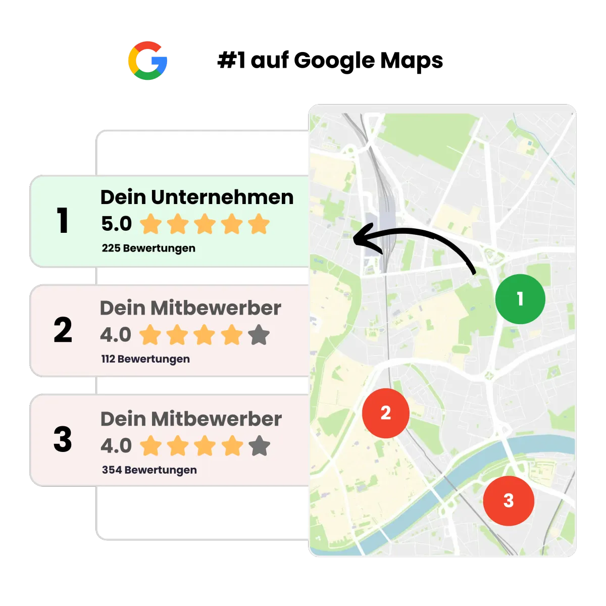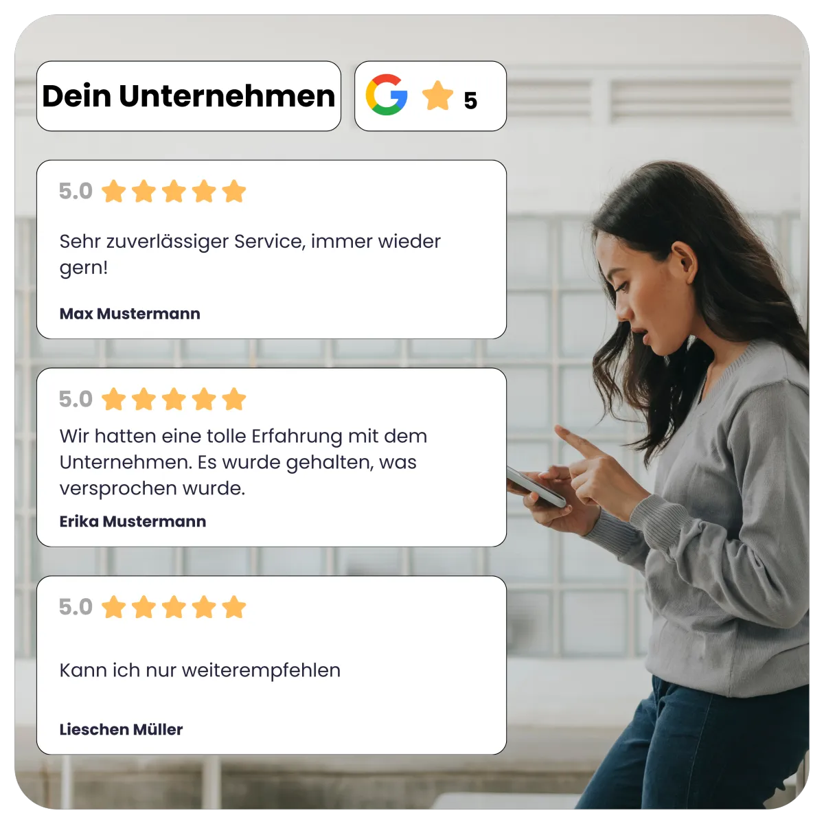 Google-Bewertungen verbesseren deine ,,digitale Reputation'', erhöhen die Sichtbarkeit in Suchergebnissen, schaffen Vertrauen bei potentiellen Kunden und tragen dazu bei mehr Besucher und mehr Umsätze für dein Unternehmen zu generieren.